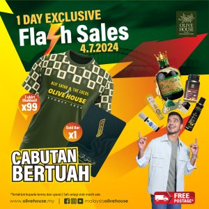 Bukan itu sahaja, bagi memeriahkan lagi FLASH SALE kali ini, Olive house juga akan menawarkan Cabutan Bertuah kepada semua pembelia yang membeli produk Olive House sebanyak RM 130 dan ke atas. Korang berpeluang memenangi GOLD BAR dan juga T-SHIRT EXCLUSIVE KOLABORASI OLIVE HOUSE DAN JUGA ALIF SATAR & THE LOCOS.